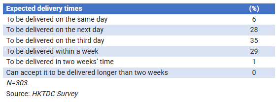 About one‑third of respondents expect products to be delivered no longer than one day after they placed orders, while some of them even prefer same‑day delivery. Another 35% expect delivery on the third day. In other words, more than two‑third of respondents from the Philippines expect to receive their orders within three days of placing orders.