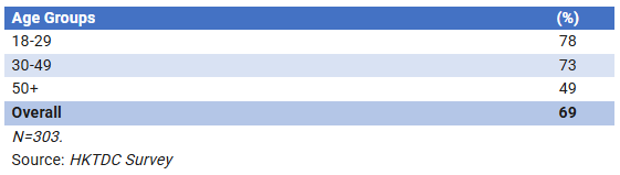 69% respondents reported purchasing Hong Kong brands or products over the past 12 months. Among them, individuals aged 18‑29 showed the highest preference, followed by those aged 30‑49, while interest on Hong Kong brands or products dropped significantly among the 50+ age group.