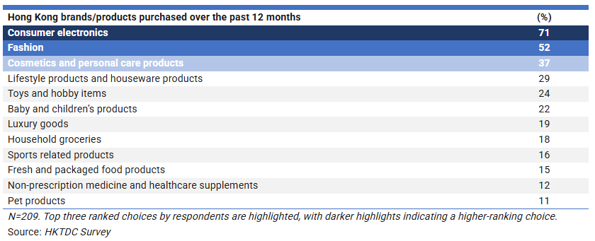 The Hong Kong brands and products that respondents reported purchasing most often were consumer electronics (cited by 71% of respondents), fashion (52%) and cosmetics and personal care products (37%).