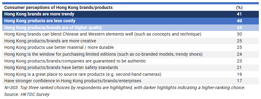 When asked about their views on Hong Kong brands or products, 41% of respondents said they are more trendy, 40% considered them less costly, and 35% believed they are of higher quality.