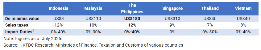 De minimis values, sales taxes and import duties in the ASEAN-6