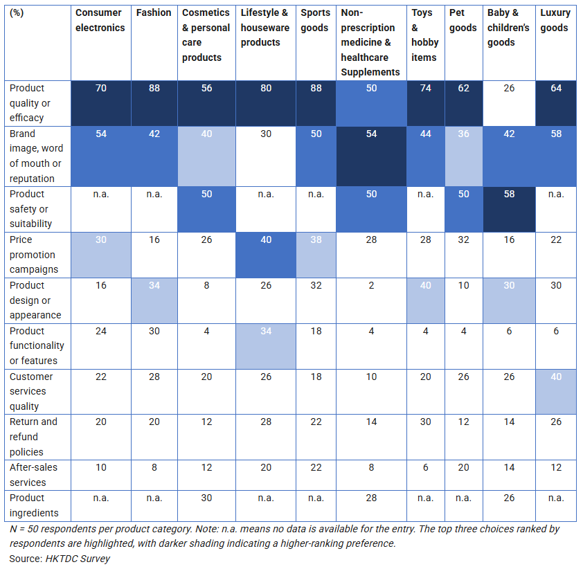 In eight out of 10 product categories, “product quality or efficacy” emerged as the most important factor when making purchasing decisions, including fashion (cited by 88% of respondents), sporting products (also 88%), lifestyle & houseware products (80%), toys & hobby items (74%), consumer electronics (70%), luxury goods (64%), pet products (62%) and cosmetic and personal care products (56%). It is also the second‑most influential factor driving the purchases of non‑prescription medicine and healthcare supplements (50%).