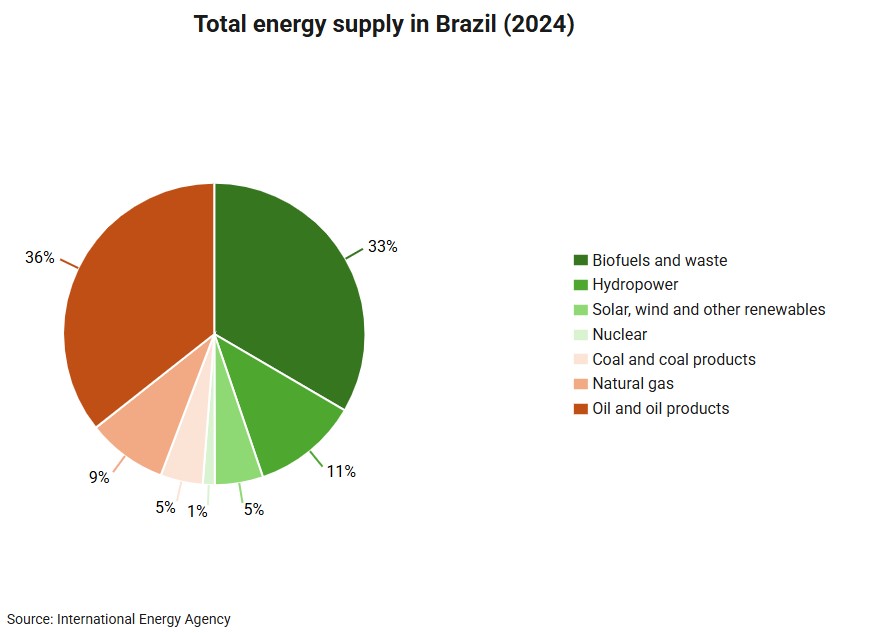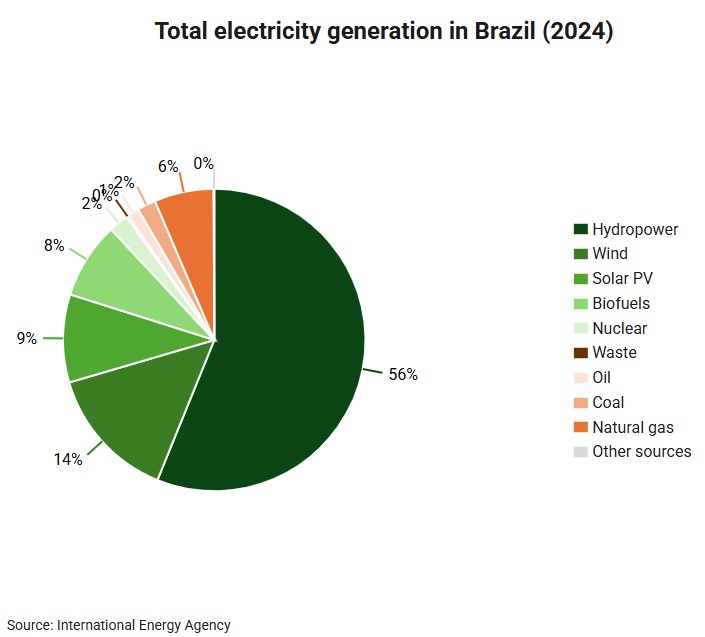 Brazil is a leader in energy transition, generating around 90% of its electricity from renewables in 2024. Hydropower is the largest source, accounting for 56% of the electricity generation in that year, followed by wind (14%), solar (10%) and biofuels (8%). Non‑renewable energies account for only 10% of the total. Brazil seeks to improve its production of renewable energies over the next decade.