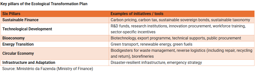 Anchored to the framework and its new sustainability target, Brazil launched several plans to accelerate its progress in different directions. Launched in 2023, the Ecological Transformation Plan (Plano de Transformação Ecológica), also known as Novo Brasil (New Brazil), aims to enhance green‑related productivity and drive inclusive, sustainable economic development by integrating fiscal reforms and technological innovations.