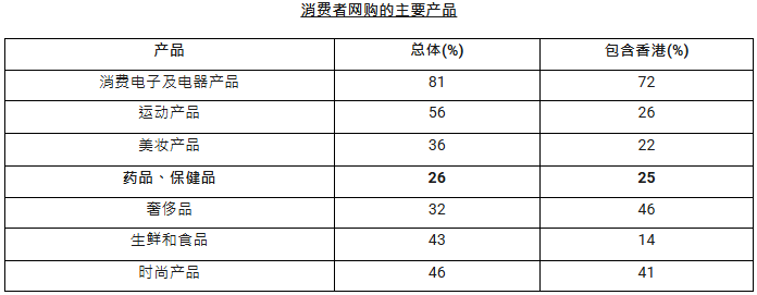 - 26%受访者表示曾网购药品及保健产品,有25%受访者表示曾网购香港药品及保健产品。30至49岁的消费群最常网购药品及保健产品。男性和女性的购买意愿相同。