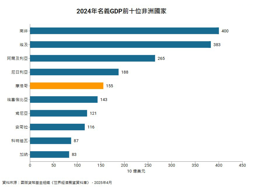 摩洛哥是唯一的非洲國家,同時擁有大西洋和地中海海岸線。2024年,該國是非洲第五大經濟體,名義國民生產總值(GDP)達1,550億美元,年增長率為3.2%,高於非洲整體的2.8%。國際貨幣基金組織預測,摩洛哥的經濟在未來5年將持續增長,2025至2030年的年均增長率將達3.7%。