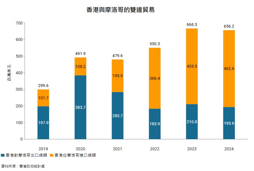 近年,香港與摩洛哥的貿易增長迅速。2024年,兩地雙邊貿易額約6.6億美元,自2019年以來複合年增長率達17.0%,遠高於同期香港與世界各國貿易總額的2.6%增長率。