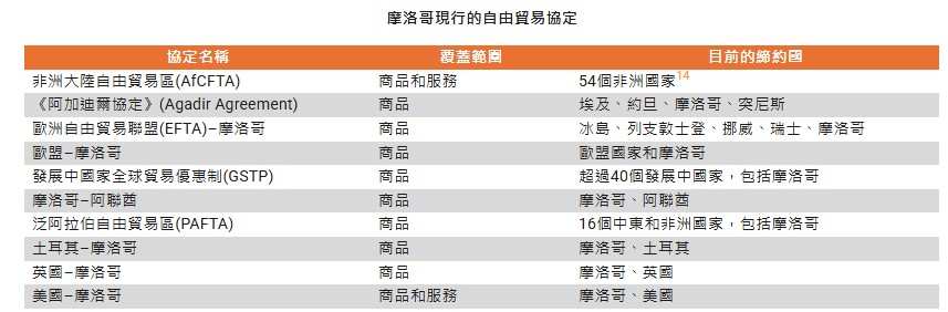 摩洛哥已訂立多項自由貿易協定,包括與62個國家簽訂優惠貿易協定。12摩洛哥是非洲大陸自由貿易區(AfCFTA)締約國,該貿易區旨在建立單一市場,覆蓋整個非洲的商品和服務,逐步取消關稅與非關稅壁壘。2025年6月12日,內地宣布將會取消包括摩洛哥在內的53個非洲國家的商品進口關稅13。雖然摩洛哥仍受制於美國目前實施的所謂「對等關稅」,但根據白宮在2025年4月的公布,摩洛哥的稅率為10%,已是所有非洲國家最低。