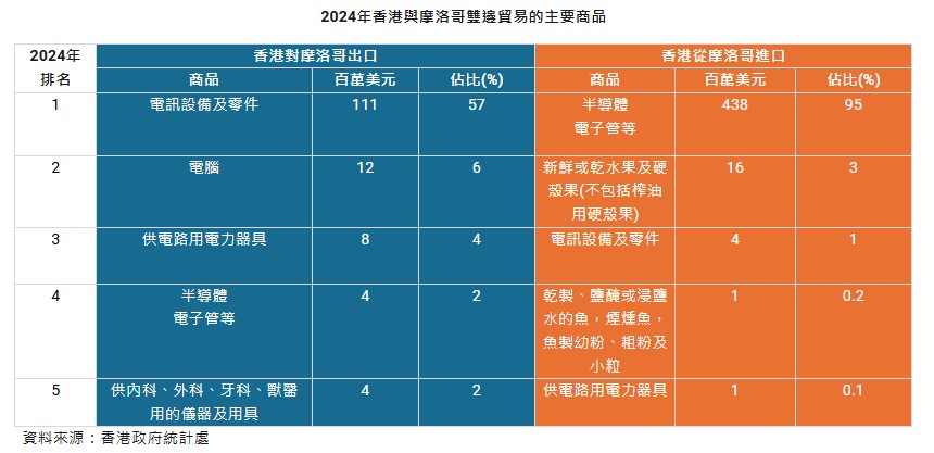 2024年,香港對摩洛哥的出口總額為1.9億美元,其中電訊設備及零件佔57%。電腦、半導體及相關零件以及供電路用電力器具,合計佔總出口額的12%。進口方面,2024年香港從摩洛哥進口總額為4.6億美元,其中半導體和電子管佔94%。