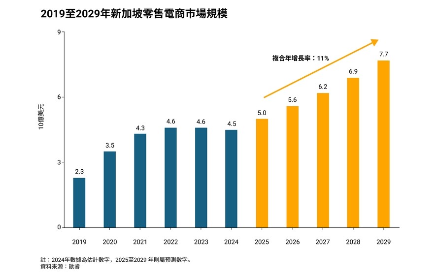 2024年,新加坡零售電商市場規模估計達45億美元。據歐睿(Euromonitor)預測,其市場規模將從2025年的50億美元增至2029年的77億美元,年均增長率為11%。