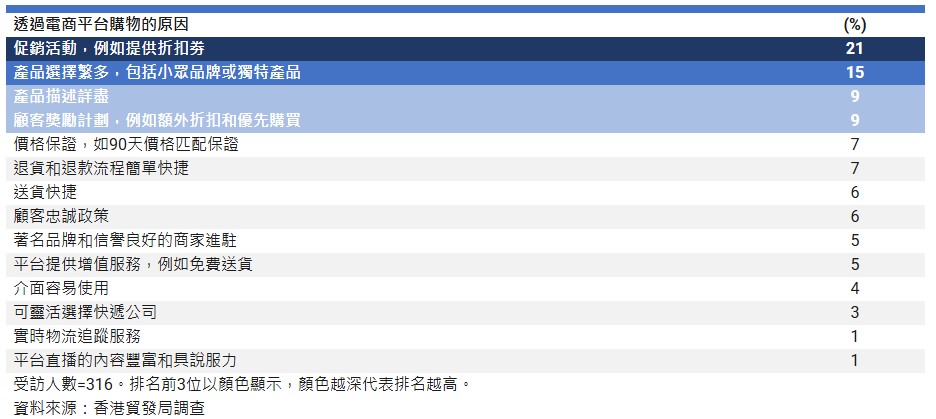所以受訪者均表示曾經透過電商平台購物,主要因為有促銷活動(21%)、產品選擇繁多(15%)、產品描述詳盡(9%)和顧客獎勵計劃(9%)。