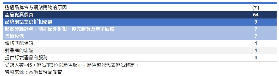 調查期內,約15%受訪者曾在品牌官網購買商品。這些商品似乎多為價值較高的產品或奢侈品,因此受訪者傾向在官網購買,以確保產品貨真價實(64% 受訪者選這原因)。