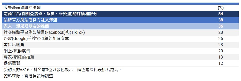 - 新加坡網購者視電商平台上的評論和評分為最重要的產品資訊來源(54%),其次是品牌官方網站或社交媒體(38%),以及家人、親戚或朋友的推薦(36%)。