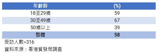 大部分受訪者(58%)過去12個月曾網購香港品牌產品。當中,30至49歲的受訪者較其他年齡群更傾向購買香港產品。