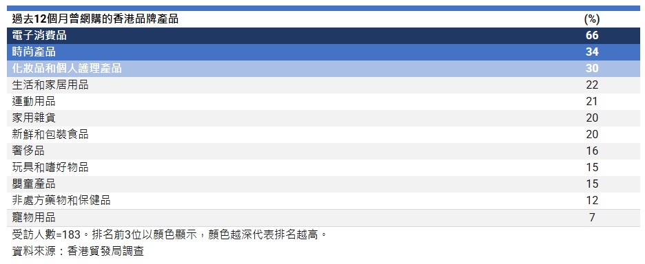 受訪者最常購買的香港品牌產品是電子消費品(66%)、時尚產品(34%),以及化妝品和個人護理產品(30%)。