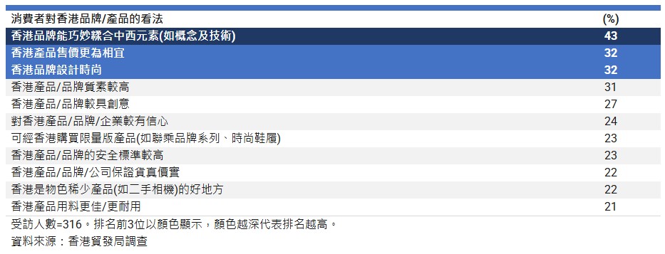 當問及對香港品牌或產品的看法時,43%受訪者表示香港產品能糅合中西元素,32%受訪者認為產品設計時尚,而且價格較相宜。
