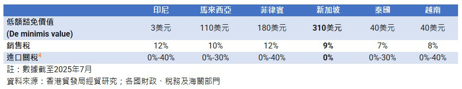 東盟六國的低額豁免價值、銷售稅和進口關稅