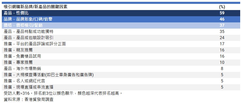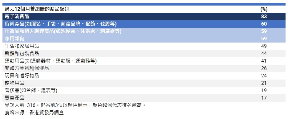 在10個產品類別中,網購以下8個類別首重產品質素或功效,即運動用品(有84%受訪者選擇)、生活和家居用品(76%)、寵物用品(60%)、電子消費品(56%)、時尚產品(54%)、化妝品和個人護理產品(50%)、玩具和嗜好物品(48%),以及非處方藥物和保健品(44%)。