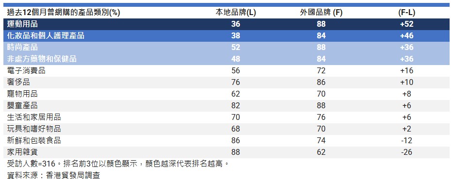 本次調查的12個產品類別中,受訪者表示在10個類別喜歡外國品牌多於本地品牌,尤其是運動用品、化妝品和個人護理產品、時尚產品,以及非處方藥物和保健品。