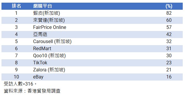 - 蝦皮(Shopee)和來贊達(Lazada)仍是新加坡兩大電商平台,分別有82%及60%受訪者在這兩大平台網購。